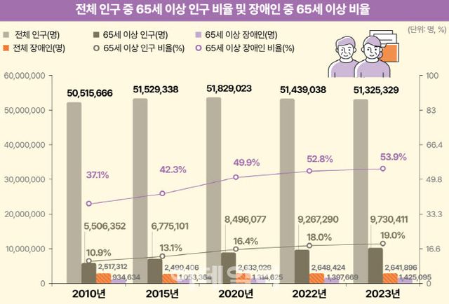 등록장애인 2명 중 1명(53.9%, 142만5095명)이 65세 이상 고령자였다. 2014년 41.4%, 2020년 49.9%였던 것이 해마다 꾸준히 늘고 있는 것이다. 연령대별 비중은 60대가 62만7665명(23.8%)으로 가장 많았다. 그 뒤를 △70대(57만1828명, 21.6%) △80대(45만4555명, 17.2%) 등이 이었다.