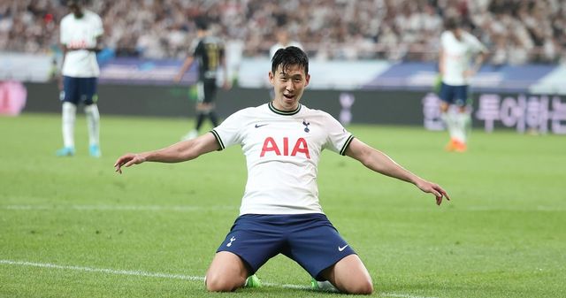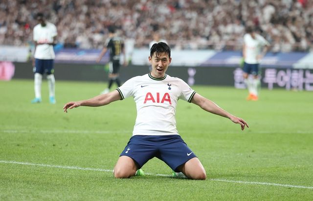 2022년 7월 13일 서울월드컵경기장에서 열린 팀 K리그와 잉글랜드 프로축구 프리미어리그 토트넘 홋스퍼의 친선경기에서 후반 손흥민이 토트넘의 여섯 번째 골을 넣은 뒤 세리머니를 하고 있다. / 연합뉴스