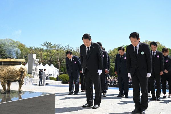 윤 대통령은 강정애 국가보훈부장관, 4·19혁명 단체 관계자들과 함께 4·19기념탑으로 이동해 윤우용 4·19민주묘지 소장의 안내에 따라 헌화와 분향하고 묵념했다.