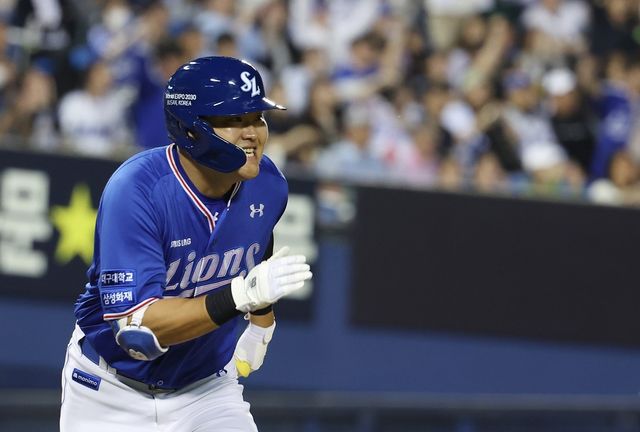 지난해 5월 24일 오후 서울 잠실야구장에서 열린 프로야구 삼성과 두산의 경기에서 8회 초 1사 만루 상황에서 삼성 오재일이 2타점 2루타를 친 뒤 그라운드를 달리고 있다. / 연합뉴스