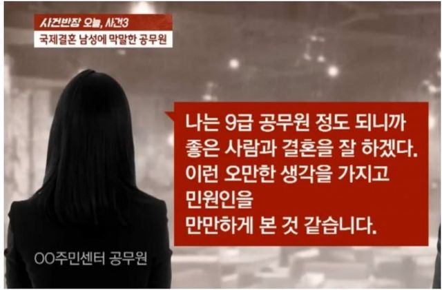 은평구 9급공무원: 국제결혼은 늦게까지 장가 못가서 외국인과 결혼하고 애낳는 수단으로 쓰는 것.