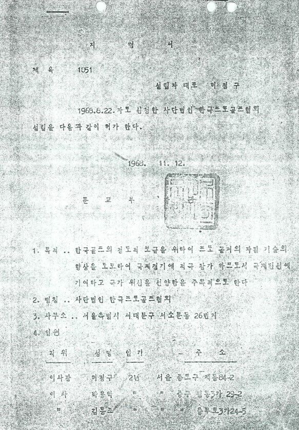 협회 창립에 유명한 일화가 있다. 1968년 박명출과 홍덕산이 라운드 중 당시 김형욱(1925~1979년) 중앙정보부장에게 ‘협회를 만들고 싶은데 도와달라’는 부탁을 했다. 이에 김형욱 부장이 경제계 인사들에게 ‘점심을 살 테니 나오라’며 현재 소공동 롯데호텔 자리에 위치한 중국식당 아서원으로 불러 모았다.