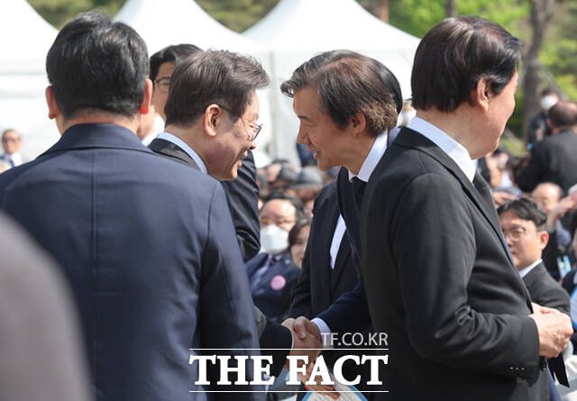 이재명 더불어민주당 대표(왼쪽)와 조국 조국혁신당 대표가 제64주년 4·19혁명 기념식에서 만나 인사를 나누고 있다.