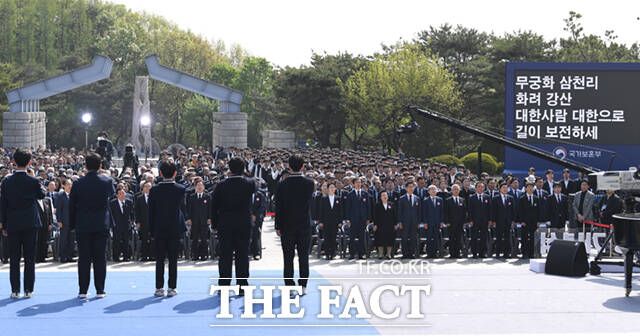 한덕수 국무총리를 비롯한 참석자들이 ‘제64주년 4.19혁명 기념식’에서 국민의례를 하고 있다.