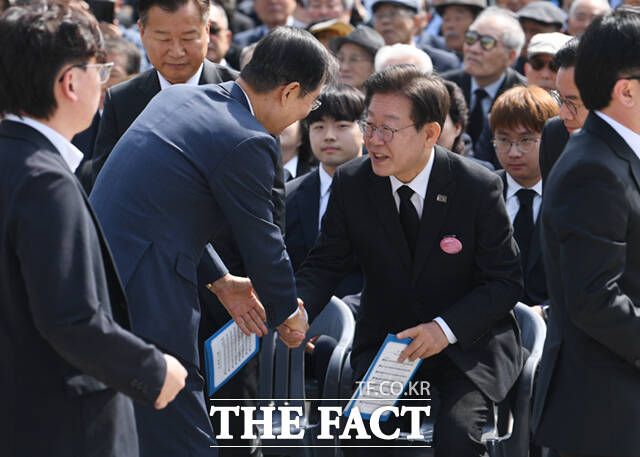 한덕수 국무총리(왼쪽)와 이재명 더불어민주당 대표가 '제64주년 4.19혁명 기념식’에 참석해 인사하고 있다.