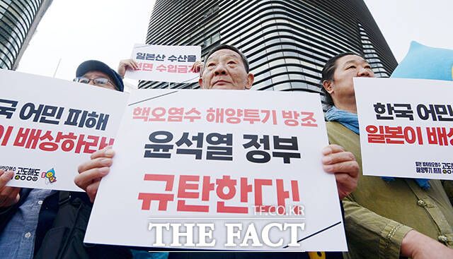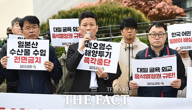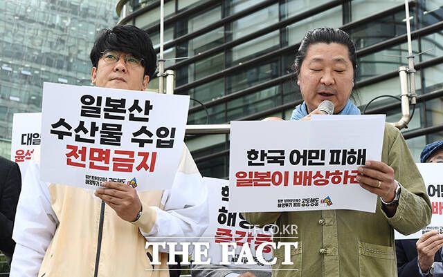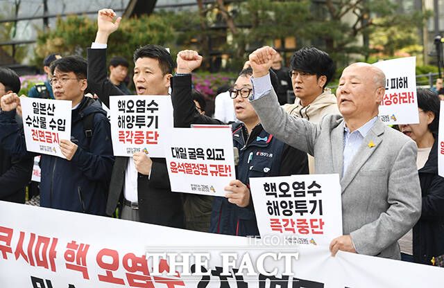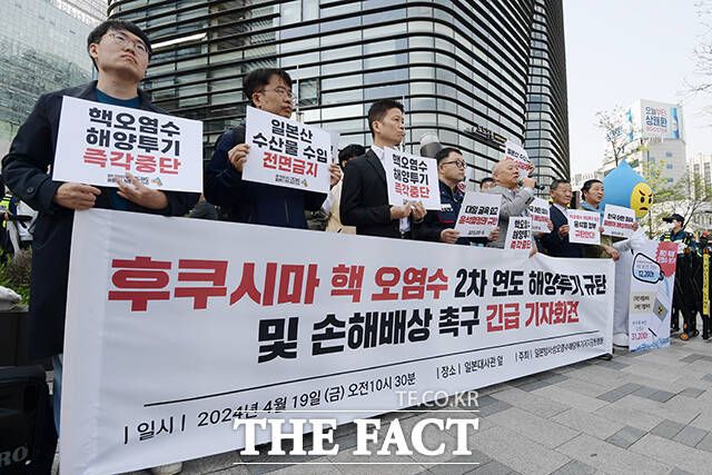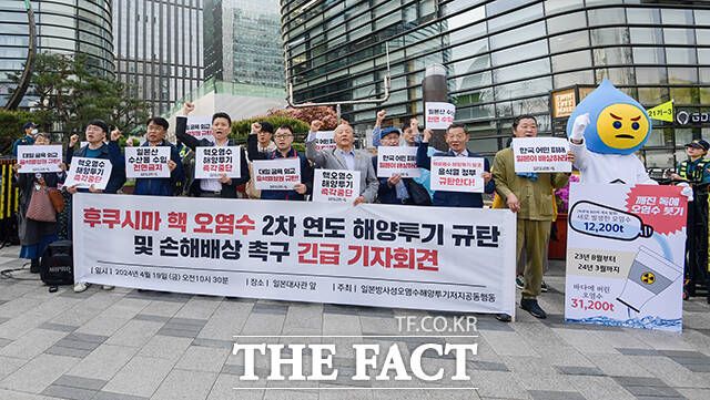 [더팩트ㅣ장윤석 기자] <일본방사성오염수해양투기저지공동행동>이 19일 오전 서울 종로구 주한일본대사관 앞에서 '후쿠시마 핵 오염수 2차 연도 해양투기 규탄 및 한국 어민 손해배상 촉구 기자회견'에 참석해 구호를 외치고 있다.