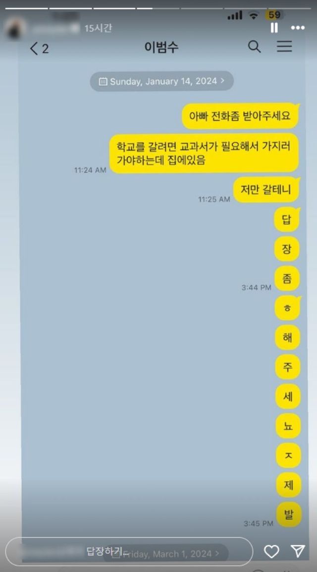 해당 메시지에서 딸은 "아빠 전화 좀 받아주세요. 학교를 가려면 교과서가 필요해서 가지러 가야 하는데 집에 있으면 저만 갈테니 답장 좀 해주세요 제발"이라며 아빠의 답을 요청했으나 이범수는 응답하지 않았다.
