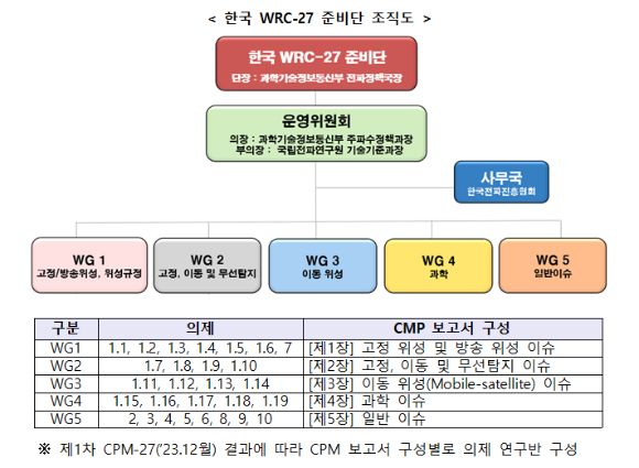ITU의 WRC-27 연구체계에 맞춰 운영위원회와 산하 5개의 의제 연구반으로 구성됐다. 운영위원회와 의제 연구반은 WRC-27 의제별 국내‧외 연구 동향 분석, 각계의 의견을 반영한 국가기고서 작성 등을 진행한다. WRC-27 준비단장은 최병택 과기정통부 전파정책국장이 맡았다.