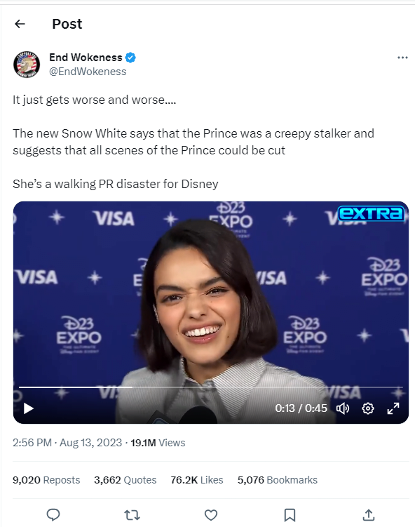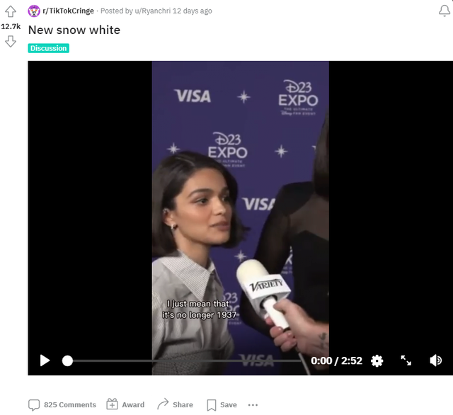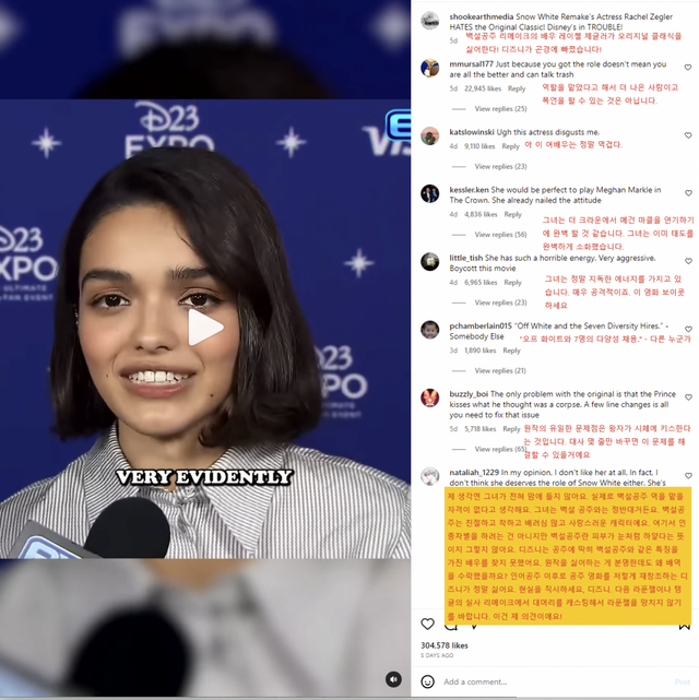 페미니스트 여배우가 백설공주 원작을 비꼬면서, “우리 영화는 옛날 1900년대 방식처럼 스토커 왕자에게 구해지고 사랑받는 것이 아닌 혼자서 단독으로 리더가 되는걸 보여줌” 라고 말했지만 이 말도 문제가 있어보이는데 인터뷰 태도가 나뻐서 더욱 부정적으로 확산되고 있음. 디즈니가 어떻게 처리할지가 의문임.