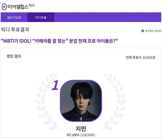 최근 방탄소년단(BTS) 지민은 마이셀럽스가 운영하는 익사이팅 디시에서 진행된 "'MBTI가 IDOL!' 카메라를 잘 찾는 '본업 천재 프로 아이돌" 설문조사에서 1위를 차지했다.
