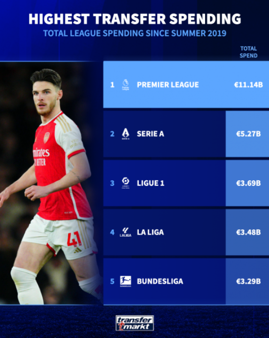 최근 5년간의 이적료 지출로만 봐도 프리미어리그가 압도적이다. 이적시장 전문 사이트인 '트란스퍼마르크트'는 2019년 여름 이후 유럽 5대 리그의 이적료 지출 현황을 공개했는데 프리미어리그가 압도적 1위였다. 2위인 세리에A와 2배 넘게 차이가 났다.
