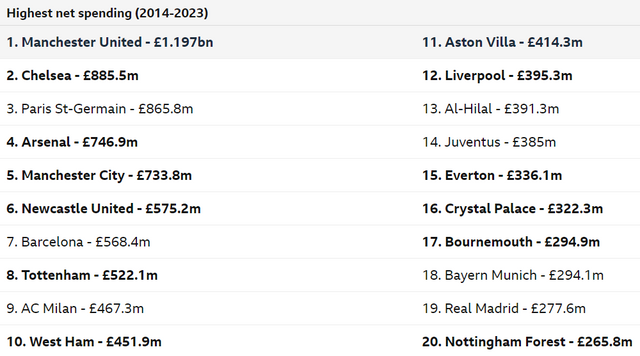 영국 공영방송 BBC는 지난 19일(한국시간) 이번 시즌 유럽축구연맹(UEFA) 챔피언스리그와 유로파리그 4강에 프리미어리그 팀이 한 팀도 없다는 사실을 조명하면서 지난 10년간 축구계 모든 구단 중에서 순 지출액이 가장 높은 상위 20개 팀을 발표했다. 순 지출액이란 지출한 이적료에서 받은 이적료를 빼는 것을 의미한다.