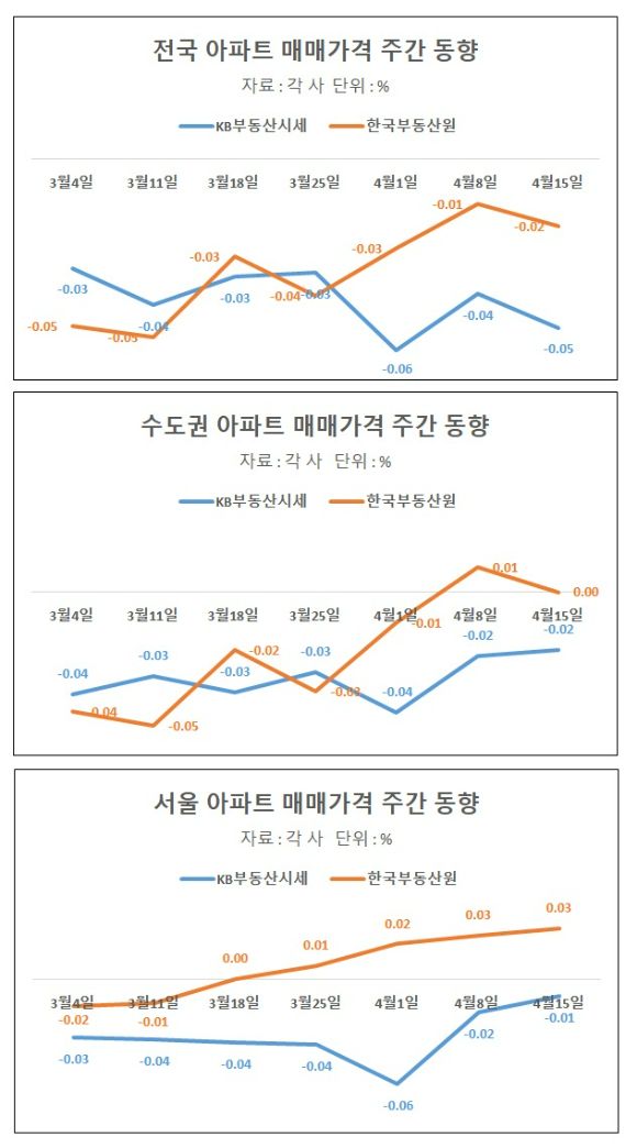 수도권으로 지역을 좁히면 한국부동원은 15일 기준 수도권(서울·인천·경기)의 아파트 매매 가격이 전 주 대비 보합이라고 집계했다. 지난 1일까지 마이너스였던 아파트 매매 가격은 지난 8일에는 0.01%오르며 플러스 전환한 것을 감안하면 제자리 걸음이다, 이에 비해 KB부동산은 수도권 아파트값이 이번 주와 지난 주 모두 각각 0.02%씩 하락했다고 공표했다.