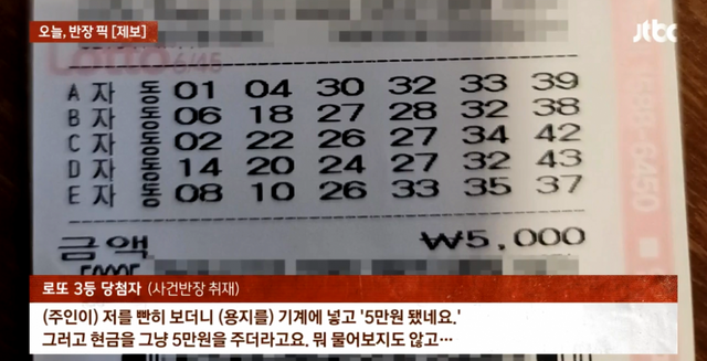 한걸음에 복권방 달려가서 사장에게 “상금 주세요” 했더니, 3등짜리를 4등 5만원 짜리로 화투판에서 볼 수 있는 밑장빼기를 하더란 거죠.