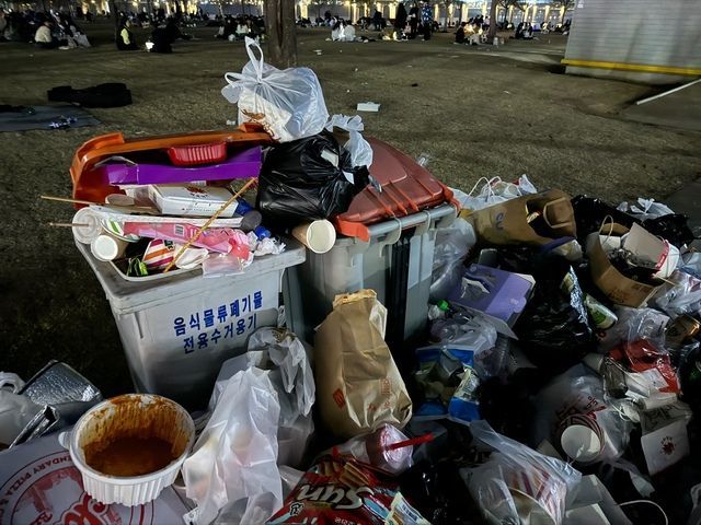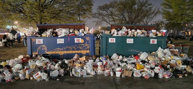 서울시에 따르면 벚꽃축제 기간 전 후 열흘 간의 쓰레기 배출량은 총 101톤을 기록했다고 한다. 평소의 5배가 넘는 쓰레기 양이다. 특히 지난 4월 7일에는 하루에만 25톤의 쓰레기가 배출되었다. 환경미화원이 투입되어 매일 치우지만 청소가 제 때 끝나기 어려울 정도. 쓰레기 무단 투기를 줄이기 위해 불법 노점상이 판매하는 거리 음식을 먹지 말아달라는 경고문까지 설치했지만 무용지물이다. 에디터의 집 근처인 서울 숲의 상황도 비슷하다. 자연을 즐기러 온 건지, 음식을 즐기러 온 건지 모를 만큼 다양한 배달 음식과 일회용기에 담긴 음료, 그리고 분리수거도 되지 않은 채 쌓여있는 용기들이 가득하다.