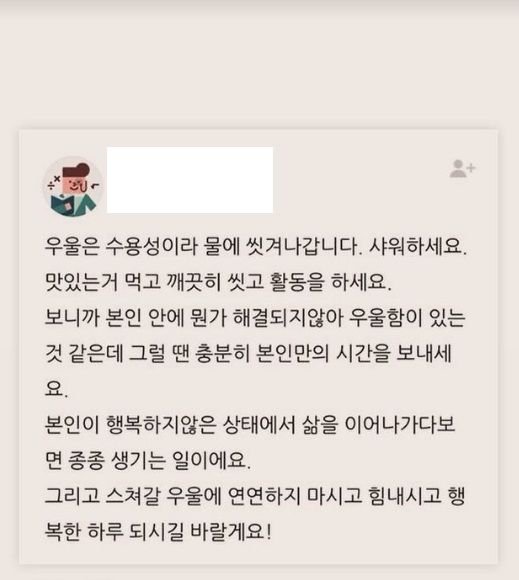 글에는 "우울은 수용성이라 물에 씻겨나간다", "본인 안에 뭔가 해결되지 않아 우울함이 있는 것 같은데 그럴 땐 충분히 본인만의 시간을 보내라" 등의 조언이 담겨있어 눈길을 끈다.