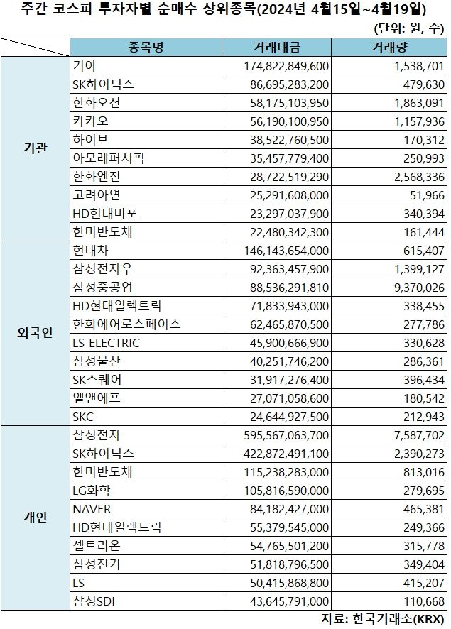 기관 '기아'·외인 '현대차'·개인 '삼성전자' 1위 [주간 코스피 순매수- 4월15일~4월19일]
