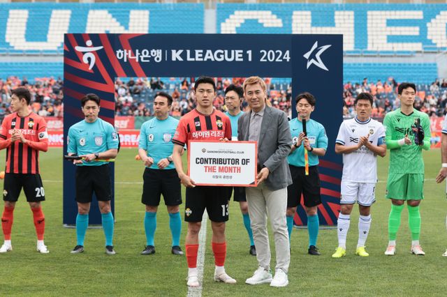 강원은 21일 오후 2시 춘천송암스포츠타운 주경기장에서 열린 하나은행 K리그1 2024 8라운드 인천 유나이티드와 홈경기에서 3월의 공헌상 시상식을 진행했다. 이달의 공헌상은 올해 신설됐다. 묵묵히 구단 발전에 공헌한 ‘언성 히어로’를 선수단, 프런트에서 1명씩 선정한다. 매월 1일부터 말일까지의 공헌을 토대로 구단이 수상자를 정한다. 수상자에게는 트로피와 상품권이 주어진다.