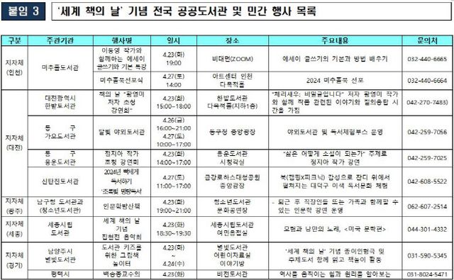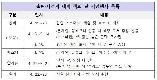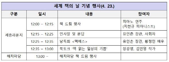 문체부는 23일 서울 광화문 일대에서 출판계, 서울도서관 등 전국 공공도서관과 함께 다양한 독서문화행사와 캠페인을 진행한다고 22일 밝혔다.