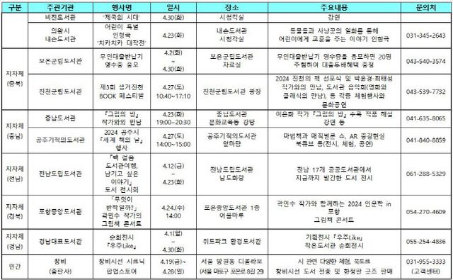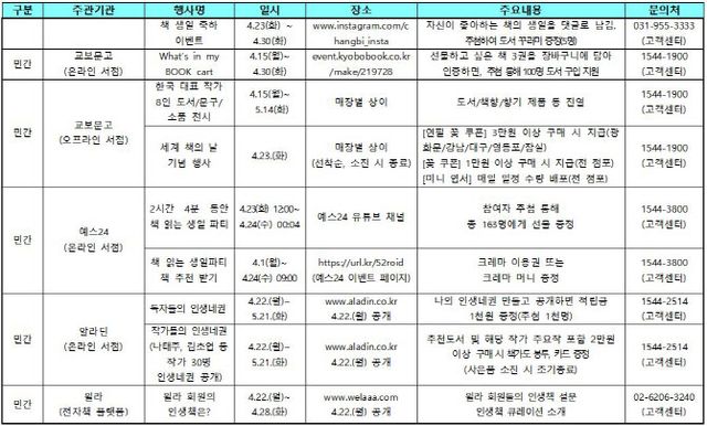 낭독회 이후에는 장강명 작가와 김민영 작가의 북토크가 이어진다. ‘더 많은 책, 더 넓은 세계’가 주제다. 온라인에서도 ‘세계 책의 날’을 기념한 캠페인이 펼쳐진다. 출판계도 ‘세계 책의 날’을 기념한 다양한 행사를 개최한다.