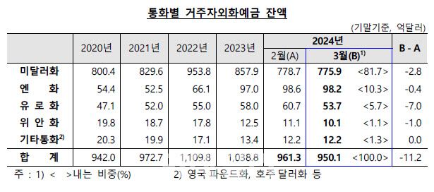 23일 한국은행이 발표한 ‘2024년 3월중 거주자 외화예금 동향’에 따르면 외국환 은행의 거주자 외화예금은 3월말 기준 950억1000만달러로 한 달 전보다 11억2000만달러 감소했다. 석 달째 감소세로, 작년 10월말(943억달러) 이후 최저 수준이다.