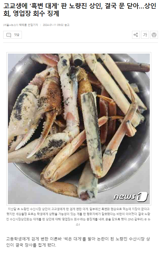 고등학생에게 검게 변한 이른바 '썩은 대게'를 팔아 논란이 된 노량진 수산시장 상인이 결국 장사를 접게 됐다.
