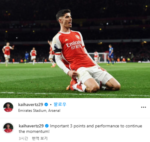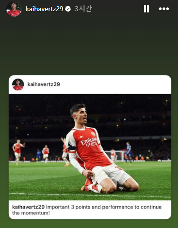 (엑스포츠뉴스 나승우 기자) 친정팀 첼시를 상대로 시원하게 골 세리머니를 선보인 카이 하베르츠(아스널)가 소셜네트워크서비스(SNS)에도 박제했다.