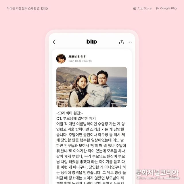 ‘아이돌 덕질 필수 스케줄 앱' 블립(blip)은 24일 포커스미디어코리아(이하 포커스미디어)와 함께한 가정의 달 캠페인 ‘내생애 최초의 아이돌’에 크래비티 멤버 원진이 부모님과의 추억을 공개 했다고 밝혔다.