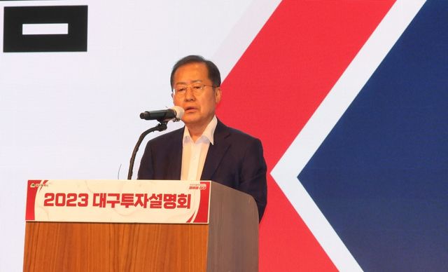 홍준표 대구시장이 지난해 6월 29일 오후 서울 여의도 한 호텔에서 열린 2023 대구투자설명회에서 인사말을 하고 있다. / 연합뉴스