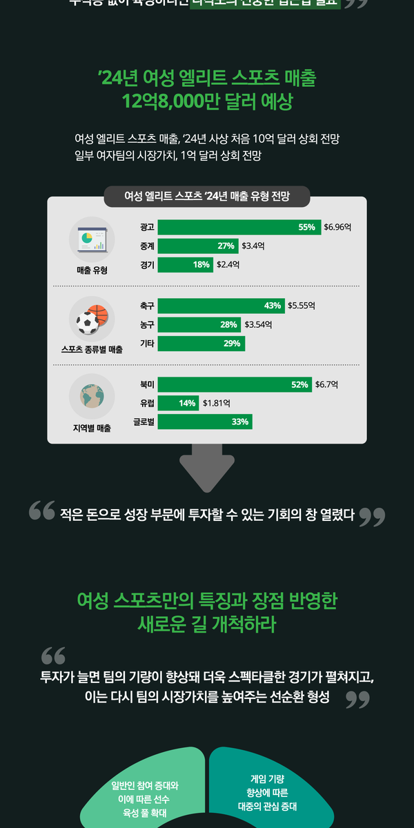 여성 팀과 리그의 시장가치가 높아지며 일부 팀의 경우 2024년 시장가치가 1억달러를 넘을 것으로 전망된다. 다만 성장 초기 단계인 여성 엘리트 스포츠를 부작용 없이 육성하고 성장세를 유지하려면 남성 엘리트 스포츠와의 차별화 및 인프라 확장, 여성 스포츠 리더 육성 등 다각도의 신중한 접근도 필요하다.