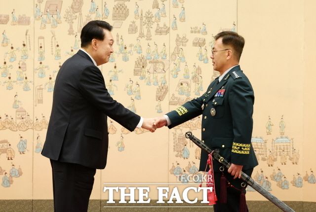 [더팩트ㅣ용산=박숙현 기자] 윤석열 대통령은 24일 대장 진급자에게 삼정검 수치를 직접 달아주며 확고한 안보 대비 태세를 강조했다.