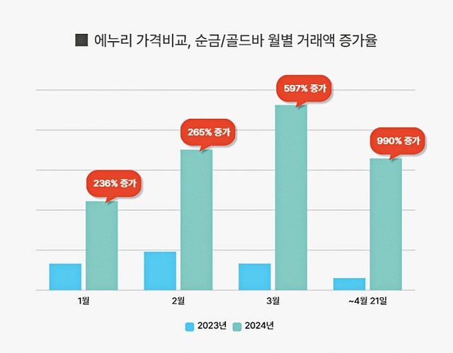 지난 22일 한국금거래소에서 확인한 순금 한 돈(3.75g)의 가격은 살 때 기준 44만 원대로 지난 1월 같은 날과 비교했을 때 20% 이상 상승하며 역대 최고치를 기록했다. 에누리닷컴은 전년 동기 대비 순금/골드바 카테고리의 매출이 결과 전년 대비 큰 폭으로 성장했다고 밝혔다.