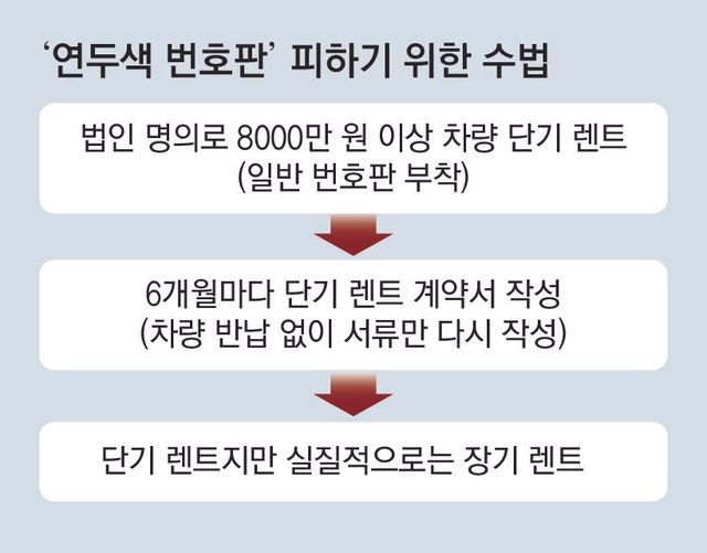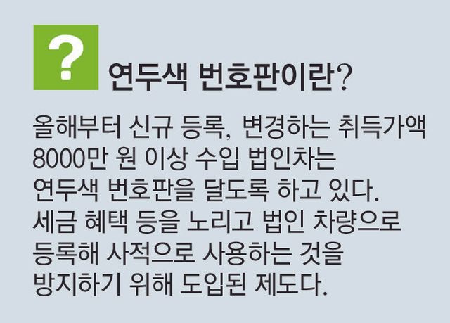 올 1월부터 취득가액 8000만 원 이상 법인 차량이 세금·보험 공제 혜택 등을 받기 위해서는 연두색 번호판을 달도록 의무화되자 이를 피하기 위한 꼼수가 판치고 있다. 윤석열 대통령의 대선 공약이었던 연두색 번호판은 고가 수입차를 법인 명의로 장기 리스나 렌트를 한 뒤 사적으로 유용하는 사례를 막고자 하는 제도다.