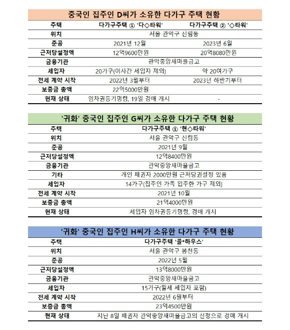 25일 아이뉴스24 취재를 종합하면 서울 관악구의 신림동과 봉천동에서 중국인 집주인(귀화 포함) D씨(38), G씨(53), H씨(41)3명이 전세 보증금을 떼어 먹은 다가구주택 사례는 확인한 것만 '다*타워', '현*타워', '골*하우스' 등 3곳에서 모두 49가구에 이른다. 보증금 총액은 67억3500만원으로 집계됐다.