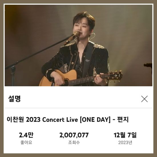 지난 2023년 12월 이찬원의 공식 유튜브 채널(일명 또튜브)에는 "2023 Concert Live [ONE DAY] - 편지"라는 제목의 라이브 실황 클립이 게재됐다.