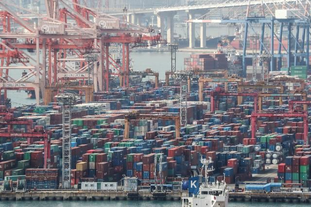 釜山港口码头堆满了等待出口的集装箱。【图片提供 韩联社】