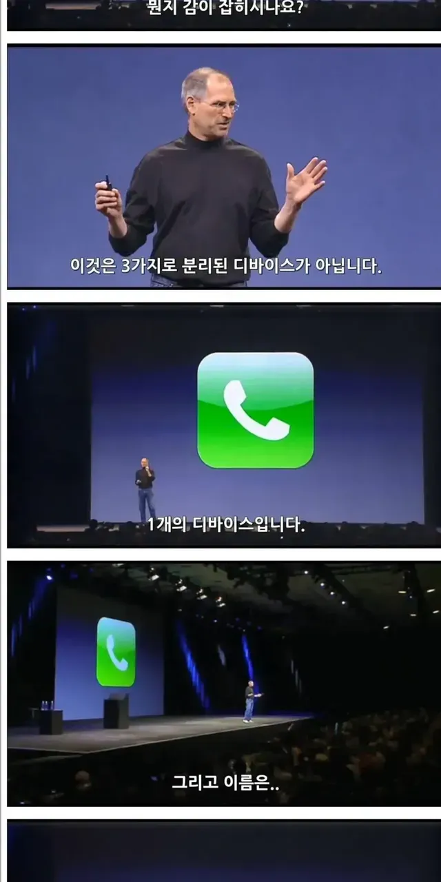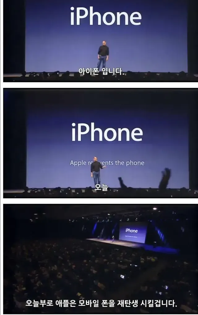 애플이 폰을 재발명 했다라는 도발적인 문구를 보여주며 아이폰을 첫 공개하는 잡스