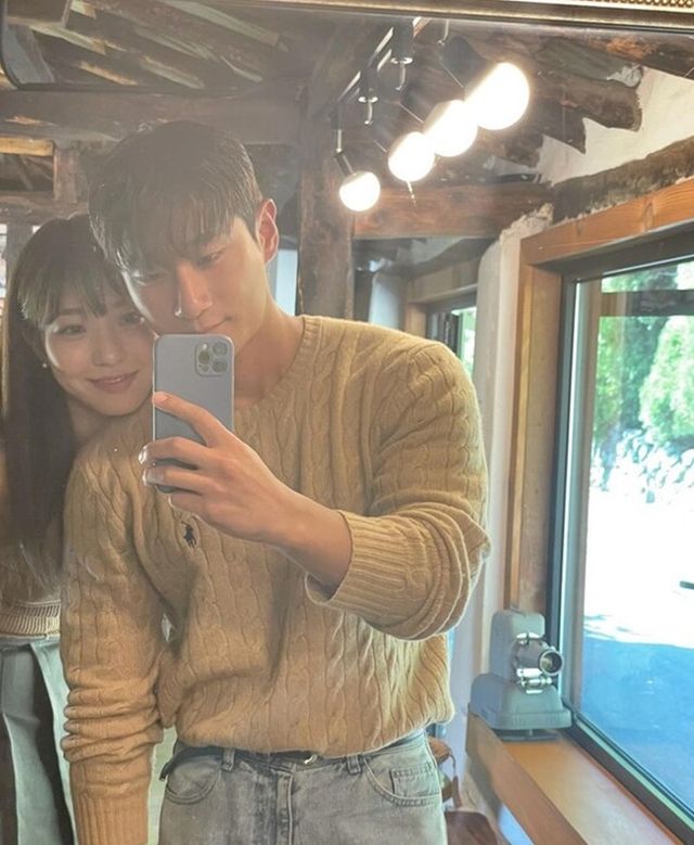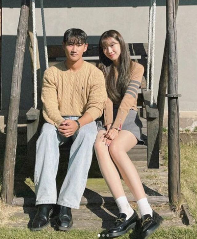 공개된 사진 속에는 그네에 나란히 앉아 있는 송다혜, 서동진 모습이 담겼다. 이들은 베이지색 니트를 맞춰 입어 커플룩 느낌을 자아내 눈길을 끌었다.