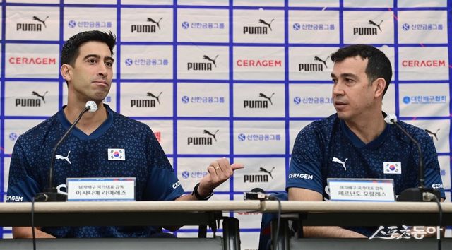 이싸나예 라미레즈 남자 배구대표팀 감독, 페르난도 모랄레스 여자 배구대표팀 감독이 25일 서울 송파구 방이동 올림픽파크텔에서 열린 대한민국 배구 국가대표팀 신임감독 기자회견에서 취재진의 질문에 답하고 있다. 주현희 기자 teth1147@donga.com