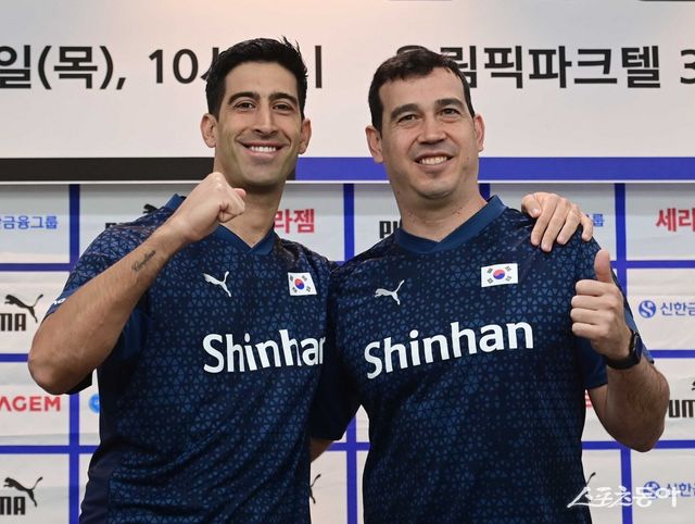 이싸나예 라미레즈 남자 배구대표팀 감독, 페르난도 모랄레스 여자 배구대표팀 감독이 25일 서울 송파구 방이동 올림픽파크텔에서 열린 대한민국 배구 국가대표팀 신임감독 기자회견에서 포즈를 취하고 있다. 주현희 기자 teth1147@donga.com