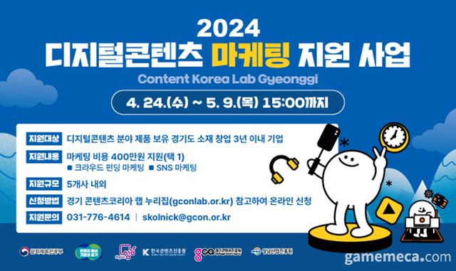 경기도와 성남시가 설립하고 경기콘텐츠진흥원(이하 경콘진)이 운영하는 경기 콘텐츠코리아 랩에서 5월 9일까지 ‘2024 디지털콘텐츠 마케팅 지원’ 사업에 참가할 경기도 기업 5개사를 모집한다.