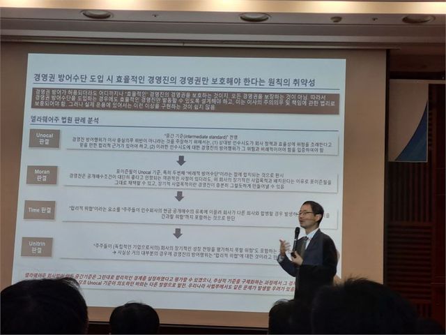 이날 발표자로 나선 송옥렬 서울대 법학전문대학원 교수는 "투자자 보호수준이 낮은 우리나라에서 지금 선행돼야 할 과제는 효율적인 경영자의 경영을 장려하고, 비효율적인 경영자의 경영을 억지하는 방향으로 자본시장의 환경을 개선하는 것"이라며 "경영권 방어만 쉽게 하면 경영진의 참호구축을 통해 사익추구가 가능하게 될 뿐"이라고 지적했다.
