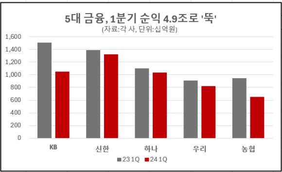 27일 실적 발표 자료에 따르면 KB·신한·하나·우리·NH농협금융그룹 등 5대 금융그룹의 1분기 당기순이익은 4조8800억원으로 전년 동기 대비 16.72%(9800억원) 감소했다.