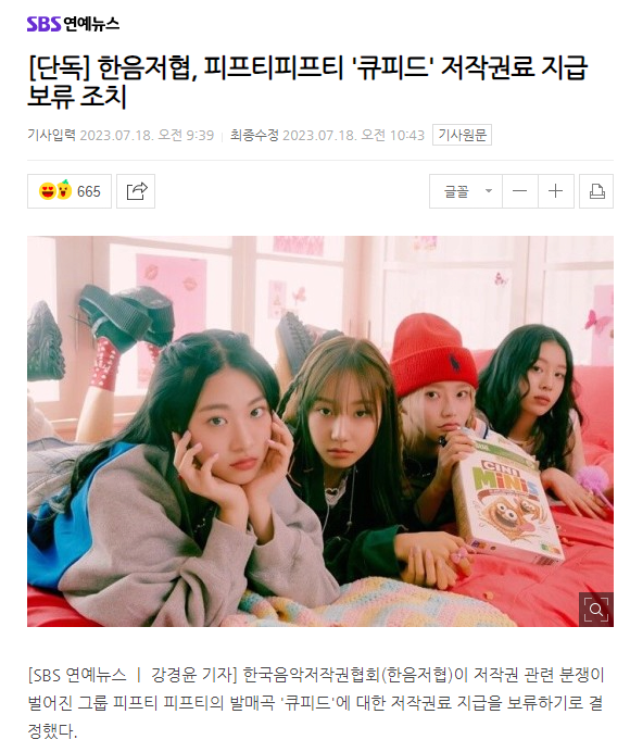 .한국음악저작권협회 측은 지난 14일 내부 규정에 따라 피프티피프티의 ‘큐피드’ 저작권료 지급 보류 결정을 발효했다. 앞서 피프티 피프티의 소속사인 어트랙트 측이 저작권료 지급 보류 요청을 제기한 것에 대해 내부 검토 끝에 이 같은 결정을 했다.