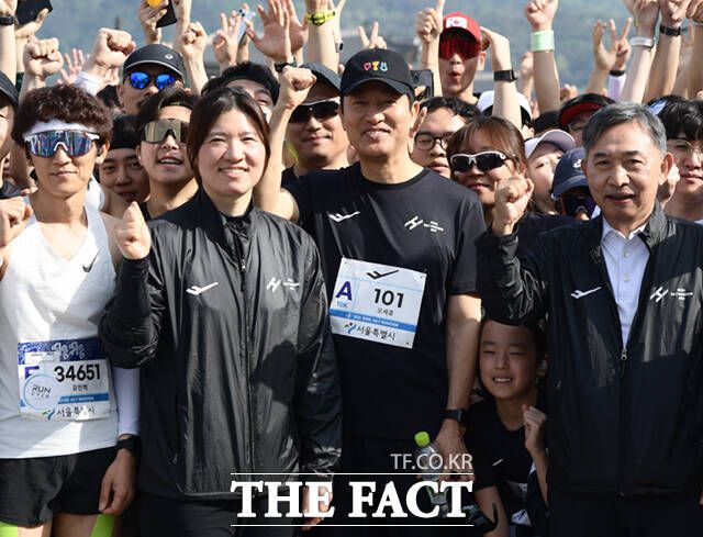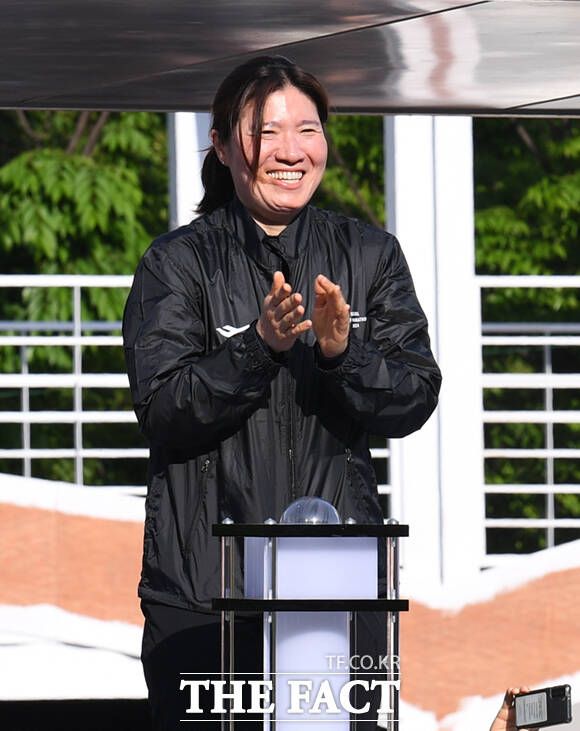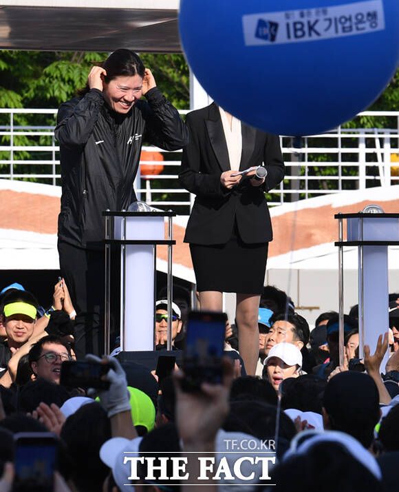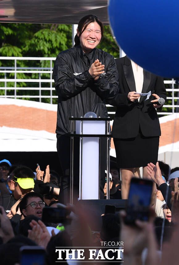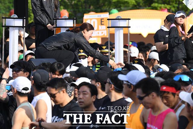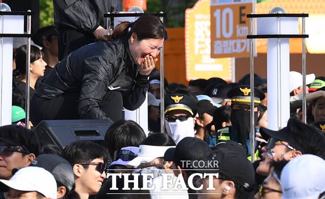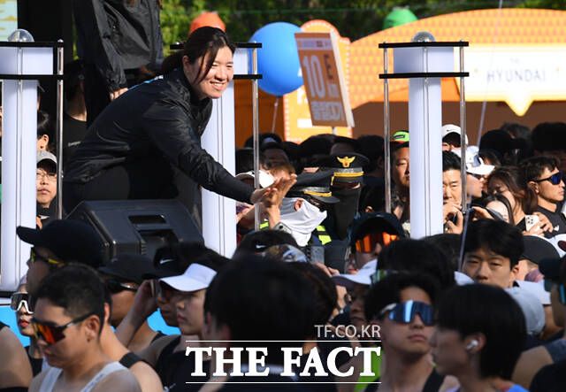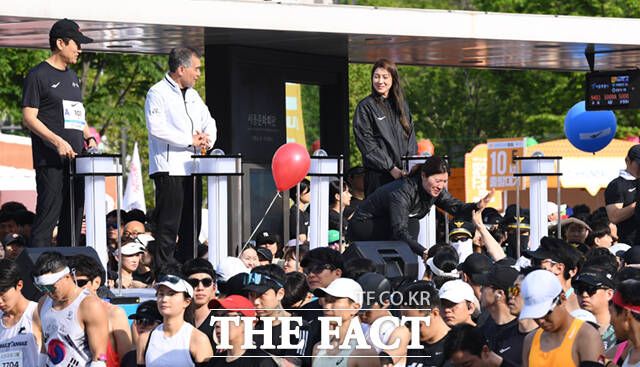 [더팩트ㅣ이새롬 기자] 장미란 문화체육관광부 제2차관이 28일 오전 서울 광화문광장에서 열린 '2024 서울하프마라톤 대회'에 참석해 참가자들을 향해 인사하고 있다.