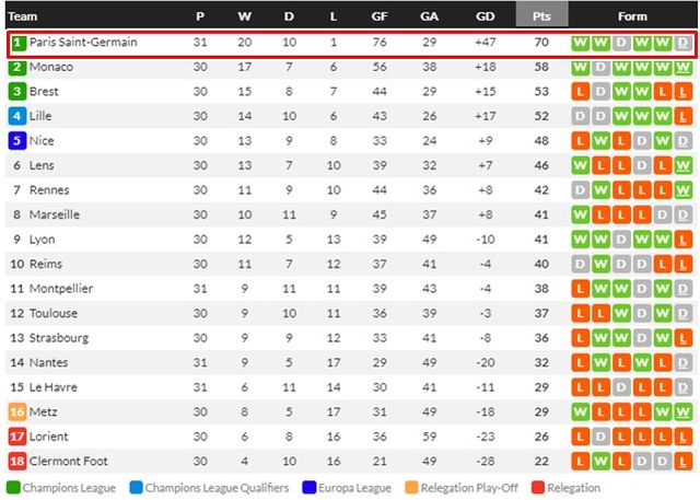 27일 현재 2023~2024시즌 리그앙 팀 순위. 1위 PSG는 2위 모나코에 승점 12점 차, 골득실 +29로 앞서 사실상 우승을 확정했다./후스코어드닷컴