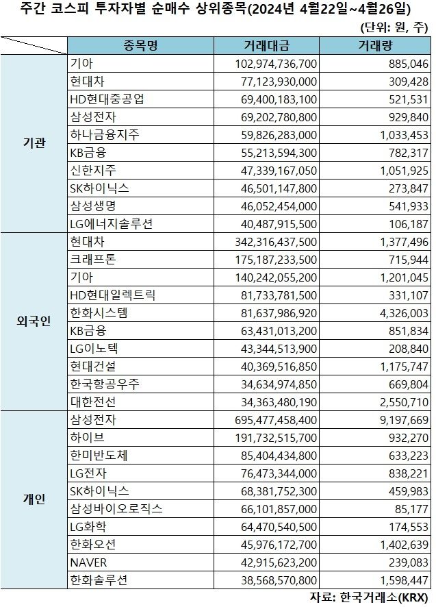 기관 '기아'·외인 '현대차'·개인 '삼성전자' 1위 [주간 코스피 순매수- 4월22일~4월26일]
