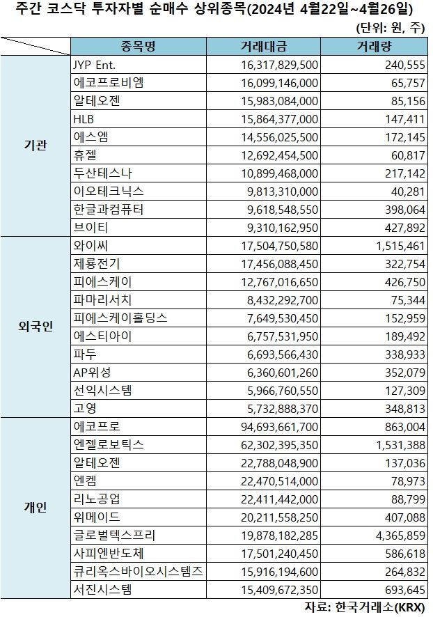 기관 'JYP Ent.'·외인 '와이씨'·개인 '에코프로' 1위 [주간 코스닥 순매수- 4월22일~4월26일]