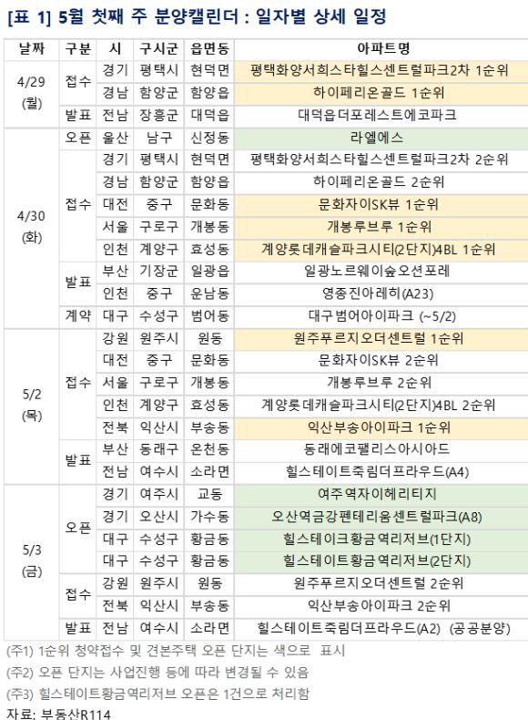 28일 부동산R114에 따르면 5월 첫째 주에는 서울 구로구 개봉동 '개봉루브루', 인천 계양구 효성동 '계양롯데캐슬파크시티', 대전 중구 문화동 '문화자이SK뷰' 등에서 청약을 진행한다.