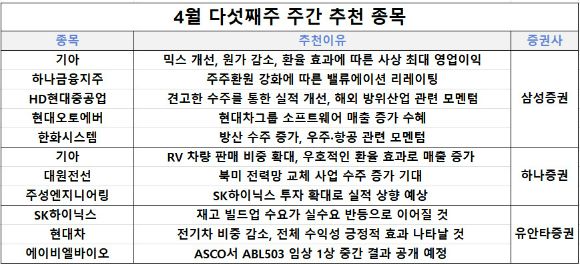 기아에 대해 삼성증권은 "믹스 개선, 원가 감소, 환율 효과에 따른 사상 최대 영업이익을 달성했다"고 말했으며 하나금융지주에 대해선 "주주 환원 강화에 따른 밸류에이션 리레이팅이 기대된다"고 설명했다.